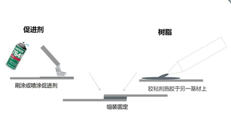 在基材表面涂覆促进剂→胶粘剂施涂另一个基材表面→两基材表面贴合固定,产生固化反应。