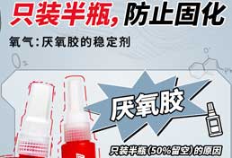 查看详情 +厌氧胶为什么只装半瓶?新买的厌氧胶为什么没装满?是缺斤短两,还是另有玄机?氧气是厌氧胶的稳定剂,半瓶设计是为了预留空间,让氧气与胶液充分接触,抑制聚合反应,防止胶水固化。乐泰厌氧胶:容器设计有说法瓶身采用低密度聚乙烯(LDPE)材料,空气可穿过瓶壁,确保厌氧胶性能稳定。